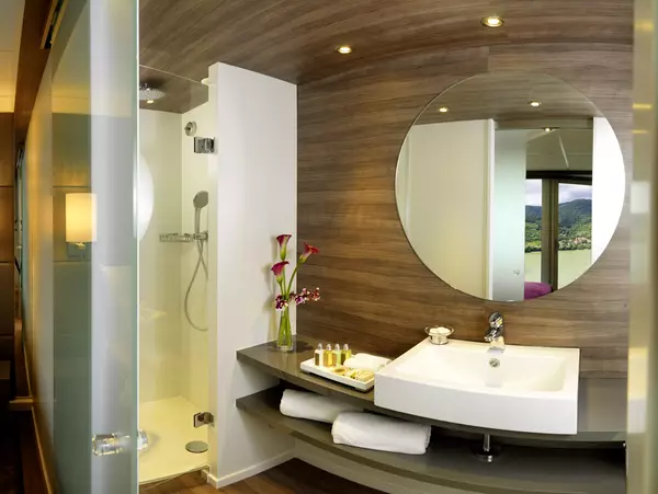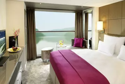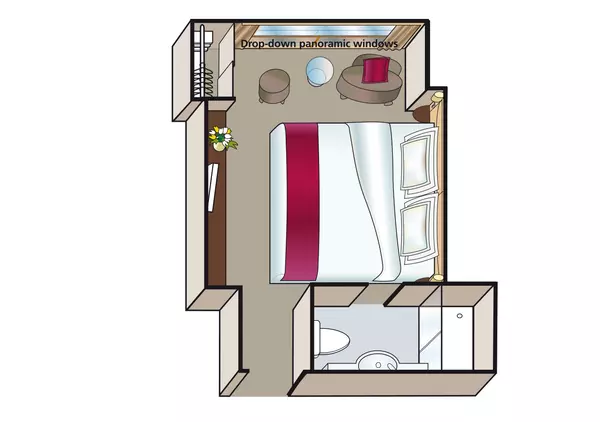Each cabin features a spacious bathroom with a walk-in shower, luxurious Rituals bath products, and a hair dryer, along with a fixed panoramic window that fills the space with natural light. Thoughtful touches like a comfortable double or twin bed, generously-sized wardrobe, secure in-room safe, flat-screen TV, individual climate control, and direct dial telephone ensure a restful and well-equipped stay.