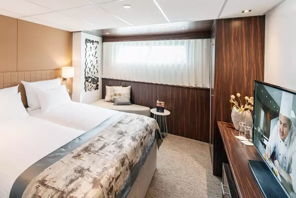 These staterooms feature the AMADEUS Signature Bed (available as a double or twin), a drop-down panoramic window for uninterrupted river views, a spacious bathroom with a walk-in shower and premium Rituals® bathing products, walk-in wardrobe, flat-screen TV, individual climate control, well-stocked minibar, in-room safe, hair dryer, and direct dial telephone — ensuring a comfortable and refined travel experience.