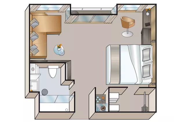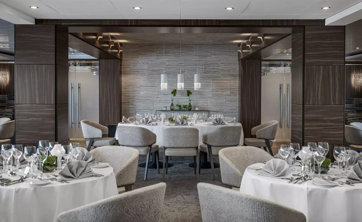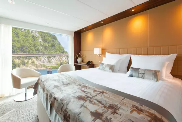 Each cabin features a spacious bathroom with a walk-in shower, luxurious Rituals bath products, and a hair dryer, along with a fixed panoramic window that fills the space with natural light. Thoughtful touches like a comfortable double or twin bed, generously-sized wardrobe, secure in-room safe, flat-screen TV, individual climate control, and direct dial telephone ensure a restful and well-equipped stay.