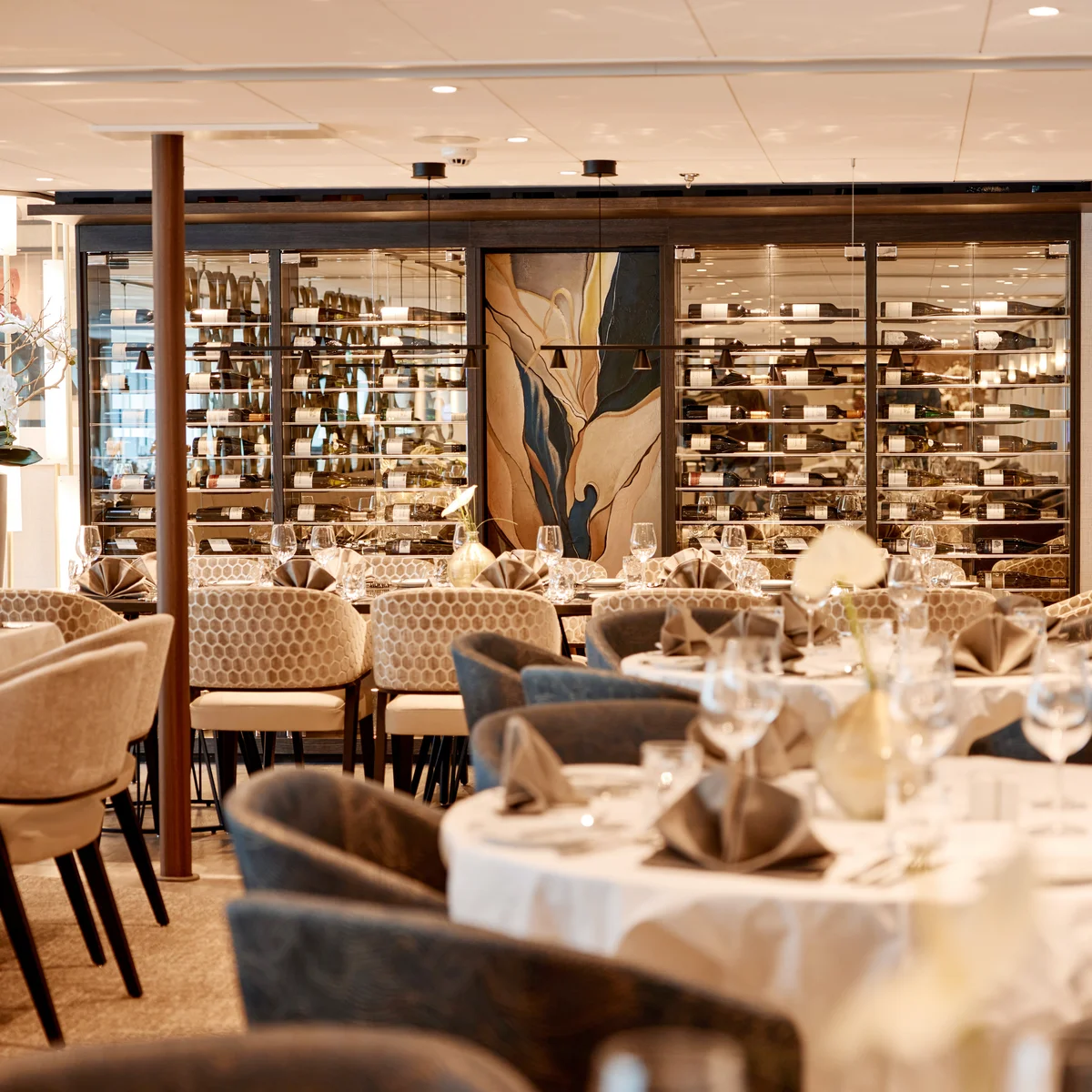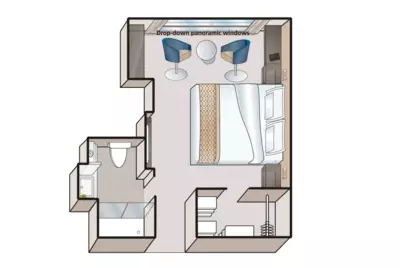 Each cabin features a spacious bathroom with a walk-in shower, luxurious Rituals bath products, and a hair dryer, along with a fixed panoramic window that fills the space with natural light. Thoughtful touches like a comfortable double or twin bed, generously-sized wardrobe, secure in-room safe, flat-screen TV, individual climate control, well-stocked minibar and direct dial telephone ensure a restful and well-equipped stay.