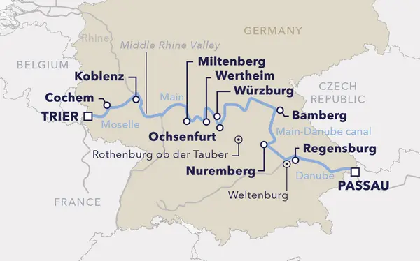 Step into a world of variety and wonder: on this 9-day cruise from Passau to Trier, Germany reveals its full spectrum. Drift along the Danube, Rhine, Mosel, and Main, where rugged landscapes meet romantic riverside views, and historic cities tell stories that blend the past with today. Stroll through the cobbled streets of Passau, Nürnberg, Koblenz, and Trier; soak in panoramic vistas from the sun deck, or savor the moment in our gourmet restaurant, Club Lounge, or panoramic bar. Wherever your curiosity leads, every moment on this river journey is pure joy.