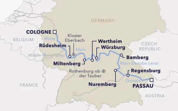 Embark on an eight-day journey filled with romance, culture, and breathtaking scenery along the Rhine, Main, and Danube. Marvel at the UNESCO-listed Upper Middle Rhine Valley with its legendary castles and the iconic Loreley Rock, stroll through the charming Main towns of Miltenberg and Wertheim, and admire the Baroque splendor of Würzburg. Discover Bamberg’s thousand-year history, experience the engineering marvel of the Main-Danube Canal, and wander through the medieval streets of Nuremberg and Regensburg. Regional specialties and lively evenings aboard ensure your cruise is as flavorful as it is memorable.