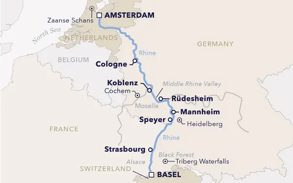 Step aboard for an eight-day river voyage rich in elegance, flavor, and unforgettable impressions, unfolding from the tri-border region near Basel to the timeless canals of Amsterdam. The Rhine guides you through its most iconic landscapes, from the dramatic Upper Middle Rhine Valley where castles crown sunlit hills and legends come alive, to the gentle Moselle with its terraced vineyards, storybook towns, and celebrated Rieslings savored at their source. Along the way, cultural treasures await in historic cities such as Strasbourg, Cologne, and Amsterdam, each revealing a distinctive character shaped by centuries of art, architecture, and life along the river.