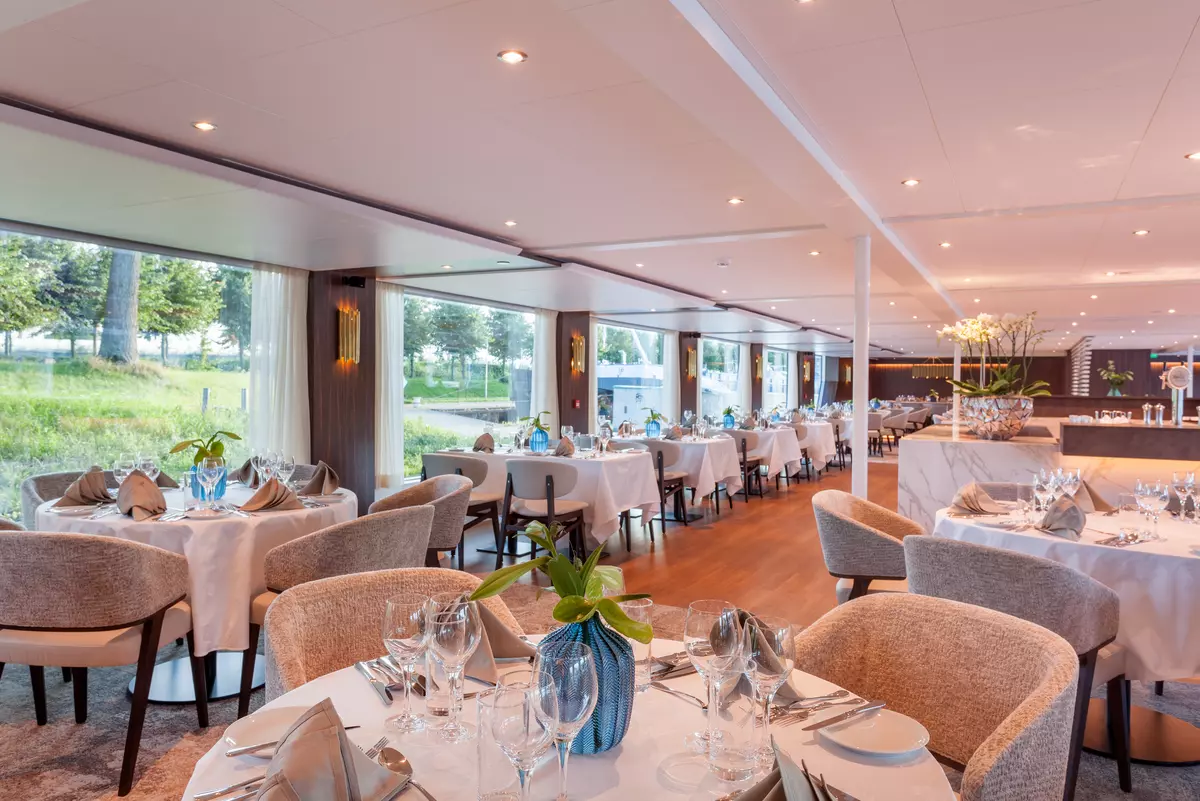 While our menus are extraordinary, our dining venue options are not complicated. All seventeen river ships are built with the same floor plan so locating the Restaurant or Bar is easy, regardless of which itinerary or ship you happen to be traveling on. And, while design and décor are custom; comfort and style are a priority.